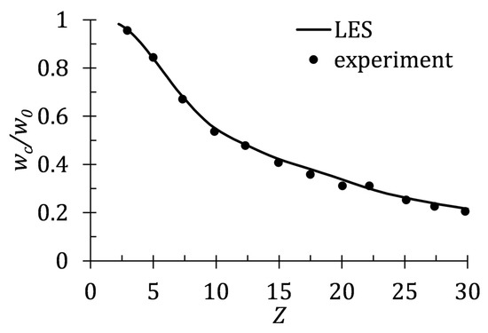 Figure 8 shows the comparison between numerical results and experimental results of Xu’s work. It can be seen that the decay of the axial vertical velocity of the jet in the LES is in good agreement with Xu’s experimental results.