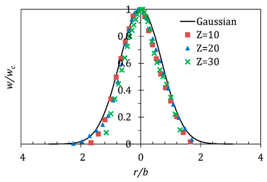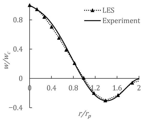 The laboratory experiment of a vertical jet in a stratified environment by Ezhova [21] is adopted to verify the development of the jet in the stratified environment in our model. The Frp of case A1 is the same as that of the laboratory experiment; thus, case A1 is used to verify the vertical velocity profile of the jet at the pycnocline. Comparison of the result from the LES model (Frp = 1.11) with the vertical velocity at the thermocline from the experiment of Ezhova and Troitskaya is shown in Figure 11.