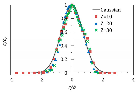 Numerical concentration and velocity of Z = 10, Z = 20, Z = 30 are extracted for verification. As can be seen from Figure 9 and Figure 10, the velocity and the concentration distribution are close to Gaussian distribution.