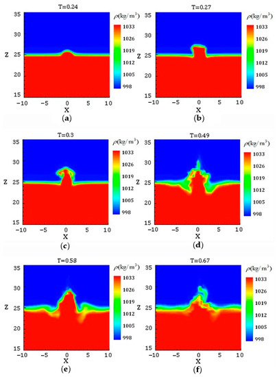 Instantaneous density contours at the plane of Y = 0 during the jet impinging on the pycnocline in case A3. (a–f) corresponding to T = 0.24~0.67.