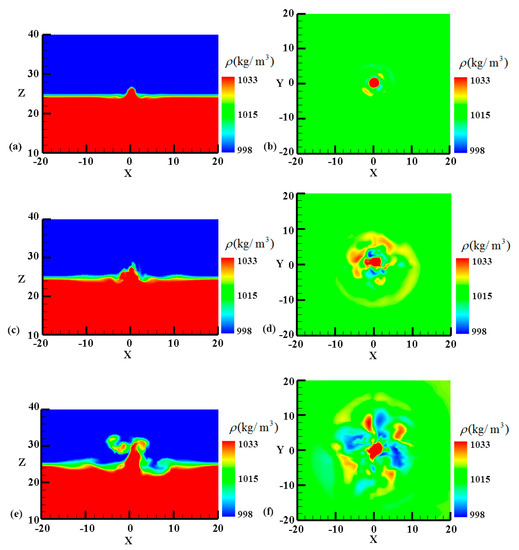 Instantaneous density contours at planes of Y = 0 (left) and Z = 25 (right) when T = 0.6. And (a,b) are the case A1; (c,d) are the case A3; (e,f) are the case A9.