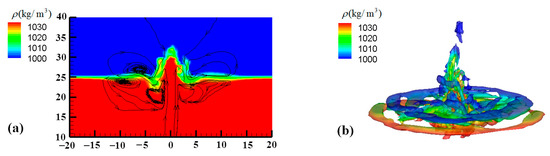 For further studying on the coherent structure caused by the interaction between the jet and the pycnocline, Ω-vortex identification method proposed by Liu [35] is used to draw 3D coherent structures. The instantaneous coherent structures of case A6 are shown in Figure 16. From the streamlines in Figure 16a, it can be seen that the jet cannot penetrate through the pycnocline completely. Part of fluids penetrates through the pycnocline, and falls back to the pycnocline again. Hence, vortices are formed on the upper of the pycnocline by the shear force due to the horizontal flow. The other part which is blocked by the pycnocline also causes vortices formed under the pycnocline. As a result, vortices with opposite directions are formed in pair on both sides of the pycnocline, and the coherent structure is shown in Figure 16b.