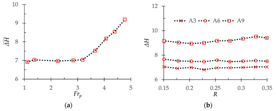 In order to illustrate the destratification of jets, the thicknesses of the pycnocline at about 60 s after impingement are extracted and the average of the dimensionless thicknesses () are calculated from R = 15 to R = 35. Figure 17a shows variations of with Frp in cases A1~A9. According to Figure 17a, the thicknesses of pycnocline in all cases obviously increase with the influence of jets, which proves the destratification of the jet. It can be also found that the destratification effects have little differences when Frp < 3, however, the destratification effects obviously increase when Frp > 3. Figure 17b shows the distributions of the pycnocline thickness in cases A3, A6, and A9. The changes of ΔH are small between the different R, thus it is reasonable to use regardless of variation of R to illustrate the destratification of jets. In addition, the destratification effect can be observed in a wide range around the jet.
