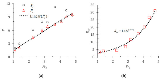 Dimensionless changes in the penetration height (a) and the horizontal influence radius (b) vary with Frp.