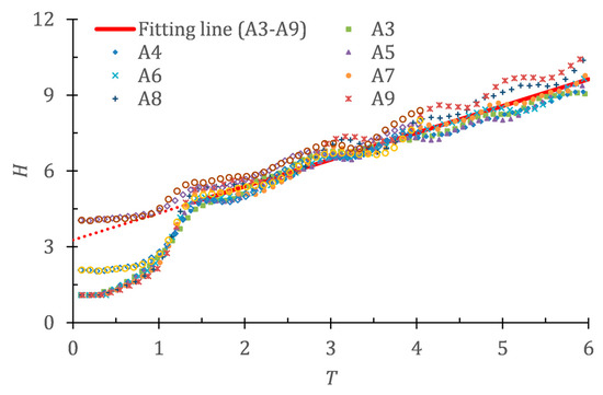 Figure 21 shows the relationship between the thickness of the pycnocline at R = 30 and the dimensionless time T. The change processes of the thickness can be divided into two stages. The first stage is T < 1.4. The pycnocline is stable when jets are far away from the pycnocline. When T = 1, the first internal wave reaches R = 30, and the thickness of the pycnocline begins to increase obviously with the influence of internal waves. Then (T = 1.4), the thickness of the pycnocline approaches to a certain value with the effect of the first internal wave. We define this value as the critical thickness Hc, and the critical thickness in different cases are very close. Even in the cases with the largest initial pycnocline thickness, Hc is a little bit thicker than the cases with small initial pycnocline thickness. The second stage is T > 1.4, the increasing rate of the thickness slows down, and the process tends to be linear. The reason is that the influence of internal waves on the thickness of the pycnocline becomes smaller when the pycnocline thickness is larger than critical value. The relationship between the H and T in the range of 1.4 < T <6 is fitted only through cases A3~A9 while cases B1~B4 in which the T only ends at 4 are used for further testing. The fitting formula is shown as follows: