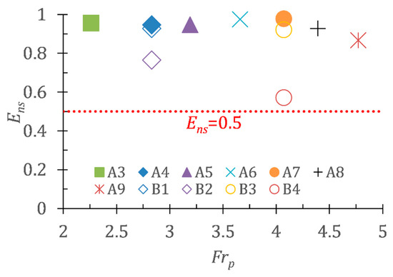 Nash–Sutcliffe efficiency coefficients of Cases A3~A9 (Frp = 2.26~4.77) and B1~B2 (Frp = 2.83) and B3~B4 (Frp = 4.07).