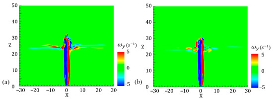 In order to find the reason that causes the change process of the thickness of pycnocline in Figure 21, the vorticity in y direction is calculated as . The instantaneous contour of ωy at the plane of Y = 0 in case A6 is shown as Figure 23. Figure 23a is plotted at the time when the first internal wave arrives at R = 30. Moreover, the vorticity contour in T = 2.2 when the pycnocline thickness is larger than the critical value is shown in Figure 23b. In Figure 23a, the vorticity in the pycnocline is large; thus, the thickness of the pycnocline has a sudden increase at around T = 1.1, and this state can be sustained until T = 1.4. However, the vorticity in the pycnocline becomes obviously smaller after the thickness of the pycnocline reaches the critical value. This is the reason that the increasing rate of the thickness apparently slows down when T > 1.4. Moreover, there are still some vortices at the pycnocline, and this is why the thickness remains increasing when T > 1.4. Above all, it could be concluded that the destratification effect is weaker when the thickness of the pycnocline reaches the critical value.
