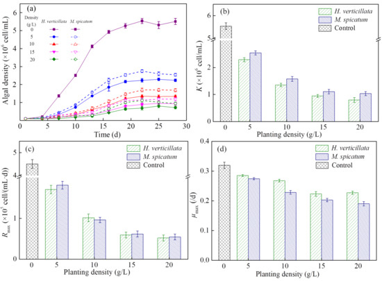 To further study, the logistic model (Equation (2)) was used to fit algal growth kinetics. Results showed that two plants not only significantly inhibited the algal biomass (K) but also the growth rate (Rmax, μmax; Figure 1b–d). The K, Rmax and μmax decreased with the increase of macrophyte density in the 0–15 g/L groups. There were no significant differences between the 15 g/L group and 20 g/L group in these three parameters. Under the same planting density, the K value in the H. verticillata group was lower than that in the M. spicatum group (p = 0.044), but the μmax value in the H. verticillata group was higher than that in the M. spicatum group (p = 0.042).