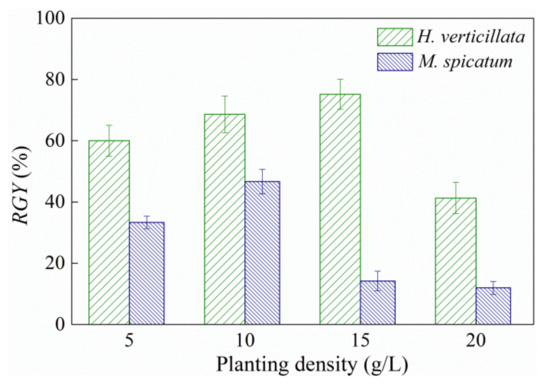 The higher planting density of submerged macrophytes had a negative impact on themselves. The relative growth yield (RGY) of the two macrophytes rose slightly and then decreased sharply with an increase in planting density (Figure 2). H. verticillata achieved a maximum RGY value of 75.17% at a planting density of 15 g/L, which was significantly higher than that in the 20 g/L group (41.29%). For M. spicatum, the highest RGY value was obtained at a planting density of 10 g/L density (which reached 46.67%), and this was significantly higher than that of the 15 g/L and 20 g/L groups (14.19% and 12%, respectively).
