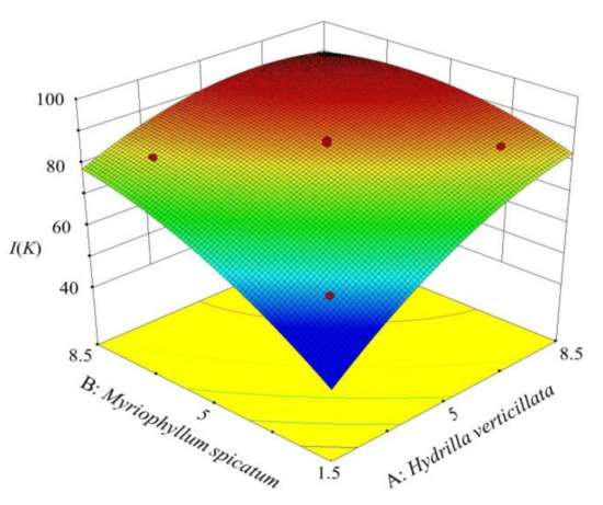 The contour of the model was an ellipse. It demonstrated that the interaction between A and B had a significant impact on the response variable [37], which was identical to the ANOVA result (p (AB) = 0.0001). Therefore, the value of I (K) was greatly affected by the two plants jointly, and the effect of the combined ratio (A/B) could not be neglected.