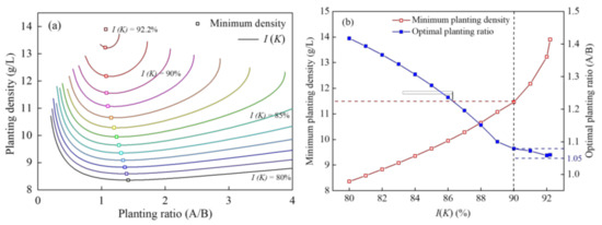 According to Equation (7), the relationship between the combined planting density, planting ratio (A/B) of two plants under different I (K) values were obtained (Figure 4a). At the same I (K) value, the combined planting density decreased sharply and then increased slowly with an increase in the planting ratio (A/B). So, the inflection point of contour line represented the minimum planting density at the same I (K) value. Furthermore, the minimum planting density that corresponded to the x-axis was the optimal planting ratio by default. The relationship between the optimal planting ratio and minimum planting density with the change in I (K) was analyzed (Figure 4b). With a rise in the value of I (K), the optimal planting ratio decreased gradually and tended to be 1.05, the minimum planting density increased linearly at first. However, the minimum planting density rose exponentially when the I (K) value exceeded 90%. The minimum planting density was 11.6 g/L, and the optimal planting ratio (A/B) was 1.08 when the I (K) value was 90%.