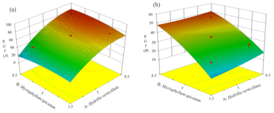 3D surface plots showing interactions between the planting density of (A) H. verticillata and (B) M. spicatum with respect to the relative growth yield (RGY) ((a) RGY (A) and (b) RGY (B)).