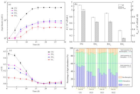 Changes in the (a) growth curve, (b) maximum algal biomass, K, (c) maximum population growth rate, Rmax and (d) maximum specific growth rate, μmax of algae with changes in planting density from 0 to 20 g/L. Results are expressed as average ± SD (n = 3).