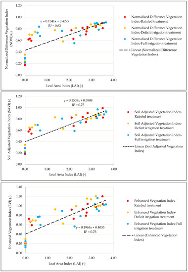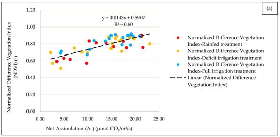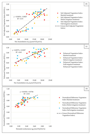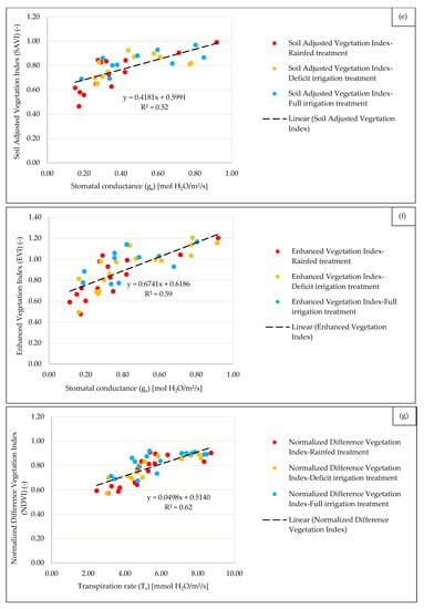 The parameters of the linear regressions linking the measured gas exchange variables (stomatal conductance, net assimilation. and transpiration rate), with thermal (WDI) and spectral (NDVI, SAVI, and EVI) VIs are presented in Figure 2 and Figure 3, respectively. The linear regression function was chosen since it was applied successfully in several other studies [70,71,72,73].