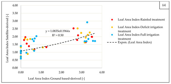 Linear regression analysis was applied to assess the relationship between crop physiological and biometric data and vegetation indices, whereas the exponential regression analysis was used to evaluate the relationship between the ground-based and satellite-based vegetation indices. The coefficient of determination (R²) was considered to judge the strength of relationships.