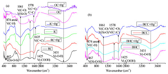 FTIR spectra before and after Hg2+ adsorption by biochar (a): RC, IC, and OC; (b): BHC and BCC.
