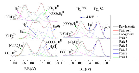 XPS characterization was carried out for biochar fractions before and after mercury adsorption, to analyze the valence changes of C, O, and Hg and to further clarify the adsorption mechanisms of mercury by biochar. Table 2 shows the peak area changes of different forms of C and O in the five biochar fractions before and after mercury adsorption. After mercury adsorption by RC and OC, the contents of carboxyl C (288 eV) decreased by 6.4% and 9.5%, and the contents of carboxyl O (534.6 eV) decreased by 9.6% and 13.0%, respectively. Meanwhile, the contents of hydroxyl O (532.4 eV) decreased by 4.7% and 5.6% in RC and OC, respectively. These results are consistent with the FTIR analysis, indicating that the –COOH and –OH functional groups on the biochar surface complexed with Hg2+. The variation of carboxyl and hydroxyl groups on the OC surface is more significant than that on RC surface, attributed to OC being weakly acidic whereas RC is alkaline. Hg2+ is more likely to form Hg(OH)2 under alkaline conditions [44], but OC contains more –COOH and –OH functional groups and, therefore, engages more Hg2+. The content of hydroxyl O on BCC surface decreased by 7.1%, while the contents of carboxyl C and O on BHC surface dropped by 5.3% and 6.8%, respectively. This indicates that the –COOH groups of BHC and –OH groups of BCC also contribute greatly to mercury removal. After Hg2+ adsorption by IC, BHC, and BCC, the areas of C peaks at 284.7 (C=C) and 531.7 eV (C=O) decreased significantly, and the O peak at 531.7 eV decreased by 3.1%, 13.0%, and 15.9%, respectively. These changes indicate that C=C and C=O are also involved in Hg2+ removal, by combining with mercury to form Hg–Cπ and remove Hg2+ [45].