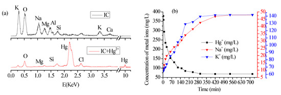 (a) EDS analysis before and after adsorption of Hg2+ by IC; (b) The concentration change of K+, Na+, and Hg2+ with oscillation time after adsorption of Hg2+ by IC.