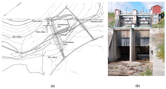 Hydropower scheme examined: (a) dam layout; (b) downstream view of spillway.