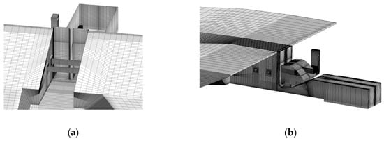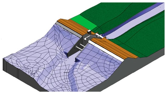 Small cells are used in areas close to the solid boundaries, across the water surface and in the jet impact zones in Cases 2 and 3. The dimensionless wall distance, defined as y+ = uτd/υ, is in the range of 10−50, where υ = kinematic viscosity of water, uτ = shear velocity and d = distance of the first cell from the wall boundary. The value of y+ should be between 10 and 100 to reasonably represent the near-wall regions. The Enhanced Wall Function is chosen for the viscous layer. The American Society of Mechanical Engineering (ASME) editorial policy statement provides guidelines for estimation of discretization errors, in which the grid convergence index (GCI) method helps check the grid convergence []. The purpose is to guarantee grid-independent solutions. For Cases 1, 2 and 3, the number of cells is 950,000, 1,350,000 and 1,750,000, respectively. Figure 5 shows the grid for Case 1 (the spillway’s upstream front is extended upwards to seal the two surface openings).