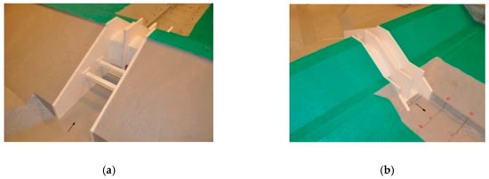 Spillway in the physical model (scale 1:30). (a) Upstream view; (b) downstream view.