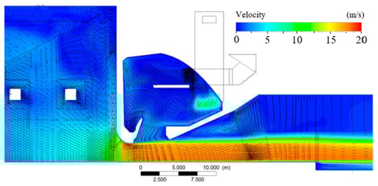 Figure 11 shows the air flow patterns in the gallery, from the shaft to the left chamber and from the left to the right chamber (from opening C to D). At the entrance R to the gallery, the local velocity amounts to 8‒9 m/s. After passing the narrower S opening, the air flow accelerates in the upper part and reaches 15‒16 m/s at maximum. The flow velocity is obviously not uniform in the gallery (Figure 11a). The air-flow velocity reaches 6‒7 m/s at the shaft intakes (M) and 8‒10 m/s in the shaft and the left chamber (Figure 11b). With air from both the left chamber and the gallery, the flow velocity is as high as 15‒16 m/s through opening D (Figure 11c). To stay in the gallery and at the door openings is obviously improper during the flood release.