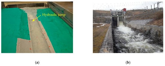 Supercritical flow in the spillway channel: (a) in the hydraulic model with hydraulic jump at the channel end; (b) in the prototype, with the left surface spillway partially opened for discharge.