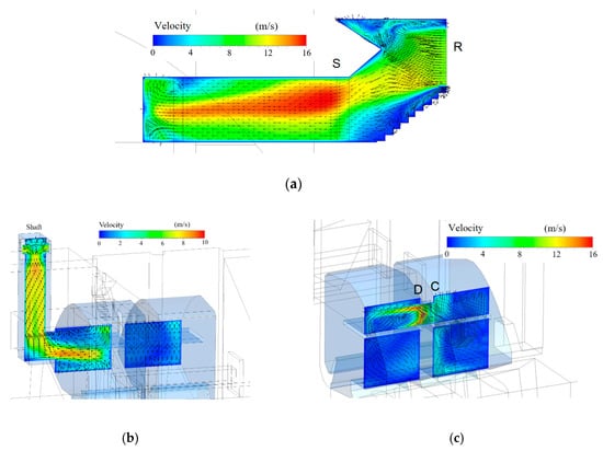 Case 1, air-flow patterns colored by velocity magnitude: (a) along the gallery’s center plane; (b) along the shaft’s center plane (parallel to dam axis); (c) along vertical plane through the centroids of door openings C and D.