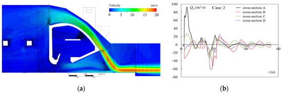 Case 2: (a) air-water flow pattern along the right outlet’s centerplane; (b) change of Qa as a function of t.
