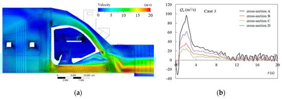 Case 3: (a) flow pattern along the right outlet’s centerplane; (b) the Qa changes.