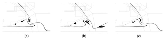 Swing of the surface jet at the impingement with the outlet jet, three subsequent instantaneous jet profiles (solid lines correspond to volume of fluid (VOF) = 0.5): (a) t = 17.9 s; (b) t = 18.5 s; (c) t = 19.1 s.