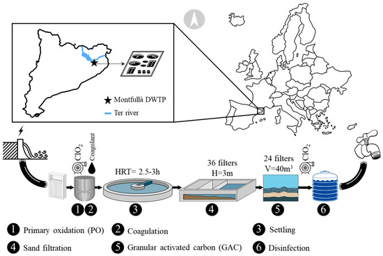 Montfullà drinking water treatment plant (DWTP) geographical location and treatment flow diagram. HRT, hydraulic retention time; H, height; V, volume.