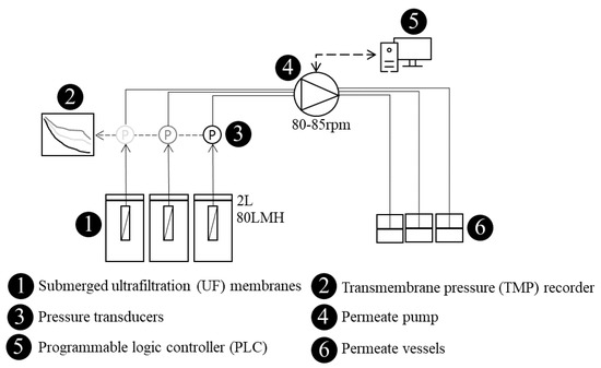 To assemble the hollow fiber (HF) UF membrane modules, a protocol to ensure that their characteristics were similar had to be developed. Each module was composed of two new PVDF fibers of equal length, (approximately 30 cm), thus, providing a useful filtration area of around 0.004 m2. The fibers used for the modules were provided by Polymem® and had a cut-off of 0.1 µm. All the modules were validated with an integrity test (5 min at 1 bar of pressure) and then the liquid permeability was assessed at 20 °C. Next, the continuous filtration experiments for estimating potential fouling were planned by maintaining a theoretical constant flux (monitored during the experiments) and evaluating the permeability as a key parameter in order to analyze the fouling potential [42,43].