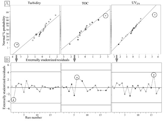 In this section, the results from model fitting and process analyses are presented. For three responses, statistics provided by ANOVA exhibited that model terms were significant (p-value < 0.05). Models did not exhibit lack of fit (p-value > 0.05), thus, indicating a significant level of confidence (lack of fit was not significant relative to the pure error). Therefore, the normal plot of residuals did not show significant deviations with respect to the linear distribution (Figure 3A). Points which differed from a linear distribution were checked and significant relevance was not detected (Figure 3B).
