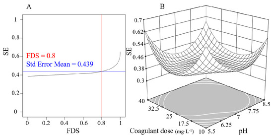 To evaluate the model, the standard error (SE) was plotted in the fraction of design space using an fraction of design space (FDS) graph, thus, providing information about the maximum predictor variability of any given factor of the total space represented by the model [47]. In our case, 80 percent of the RSM design falls at or below 0.44 units of SE (see Figure 4A). The representation of SE in our RSM is useful in order to determine its prediction power. In this case, the model is less affected by intermediate values of pH and coagulant dose (Figure 4B) because the CCD is a design composed of six center points, and therefore more robust in the middle of the represented space. However, in the corners, close to our design limits, the model is affected by the lack of predictability, i.e., regions where the response cannot be predicted as precisely.