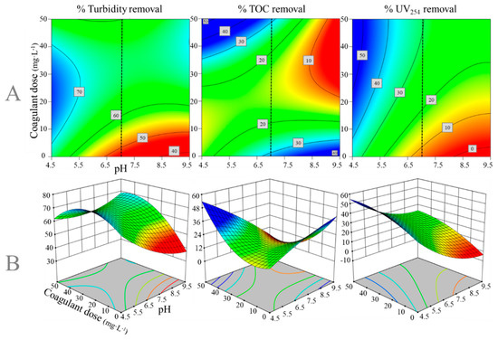 (A) Two-dimensional (2D) response surface plots and (B) three-dimensional (3D) response surface plots of turbidity, total organic carbon (TOC), and UV254 removal for the model factors, coagulant dose and pH. Dotted line in 5A corresponds to pH = 7.