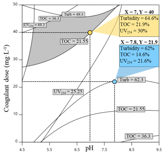 Subsequently, the model was numerically optimized with the aim of determining a common surface response in order to achieve satisfactory levels of removal for the three aforementioned responses. The optimization criteria were fixed by evaluating the minimum and maximum removals per run and response (see Table 3). For turbidity, the minimum removal was 47.1% and the maximum 77.5%, for TOC 6.8% and 36.3%, and for UV254 1.2% and 49.3%. The suitable low range was calculated following Equation (6), thus, ensuring, at least, the mid-upper percentage of removal in the obtained response range. The upper range of response removal was the maximum obtained after the jar test experiments (Table 3). Hence, selected ranges were superposed in a common surface, and the overlay graph was obtained (Figure 6). In Figure 6, the area shaded grey illustrates the surface area where the optimization criteria were achieved: 62.3–77.5% removal for turbidity, 21.55–36.3% for TOC, and 25.25–49.3% for UV254. As in the discussion above, pH 7 was determined to be the best value for a feasible level in a real DWTP operation. For the model developed here, the yellow circle (pH = 7 and coagulant dose = 40 mg·L−1) represents the optimized proposal for coagulation.
