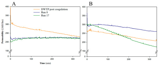 Permeability evolution over time was monitored. The reduction of permeability was related to fouling properties [50]. The results shown during the dry period (Figure 7A) revealed that the decrease in permeability was higher in the DWTP sample than Runs 8 and 17, although the initial value being the largest. The UF membrane with the DWTP sample was the most fouled and experienced a 30% permeability loss. A comparison of these results with the after-flood (AF) event experiment (Figure 7B) seems to indicate that there is no apparent relationship. After the flood, Run 17 presented the most fouled sample, with a decrease in permeability of over 40%.