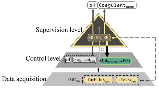 For EDSS implementation, it is important to define an operating structure which should make it possible to work with a fast and easily updated version of the system and to include any new requirements (legislation updates and modifications), new models, or new DWTP treatments. In that sense, the EDSS architecture has to be structured hierarchically in order to perfectly visualize all the modules or codified knowledge [31,32]. Consequently, a three-level architecture can be defined as data acquisition, control, and supervision [33]. According to this study, the control level represents the engine of the whole EDSS.