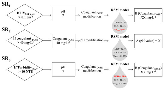 - SR1 intensifies the enhanced coagulation (pH and dose of coagulant) to achieve 50% UV254 removal (modify RSM optimization criteria) to ensure a high quality post-coagulated water prior to filtration. This SR works when an influent UV254RAW value is higher than 0.1 cm−1 so as to avoid sand filters pore blocking and increase their useful life. SR1 acts with a fixed optimum pH = 7 and modifies the coagulant dose of the control level optimization criteria (Figure 9). In addition, this SR decreases the costs associated with sand filters and CAG replacement (>50% of DWTP total annual costs).