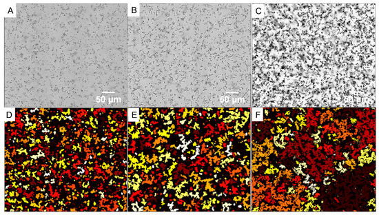 Large-stitched images of asphaltene aggregates at the end of each experiment. (A–C) represent bright-field images of aggregates formed by adding 52 vol%, 55 vol%, and 57 vol% heptane to model oil, respectively. (D–F) represent the corresponding binary images after applying Ostwald’s global thresholding criterion. The scale bar is 50 μm.