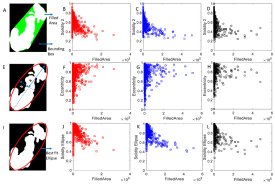 Morphology parameters and criteria used for identification of single particle, small and large clusters. (A,E,I) demonstrate the definition of Solidity 2, Eccentricity, and Solidity Ellipse, respectively. Specifically, Solidity 2 is the ratio of filled area to bounding box; , where and are the semi-major and semi-minor axes of the best fit ellipse respectively; Solidity ellipse is the ratio of filled area to area of the best fit ellipse. (B–D,F–H,J–L) represent plots of Solidity 2, Eccentricity, and Solidity Ellipse as a function of Filled Area (in pixel) of aggregates formed respectively, upon addition of 52 vol% (red squares), 55 vol% (blue squares), and 57 vol% (black squares) n-heptane. Small clusters were identified under the following criterion: Solidity 2 < 0.9 & Solidity 2 > 0.7 & Eccentricity < 0.5. Large clusters were identified under the following criterion: Eccentricity > 0.7 or Solidity_ellipse < 0.9. Single particles were identified under the following criterion: Solidity 2 < 0.9 & Solidity 2 > 0.7 & Eccentricity < 0.5 & Filled Area < 2000 (in pixel).