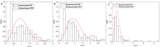 Cluster size distribution of aggregates formed at different precipitant concentrations. (A–C) represents aggregation induced by adding 52 vol%, 55 vol%, and 57 vol% heptane into model oil, respectively. Cluster size distributions for each experiment are normalized by their respective mean values to facilitate direct comparison. The red lines are the particle size distribution for Smoluchowski kinetics.