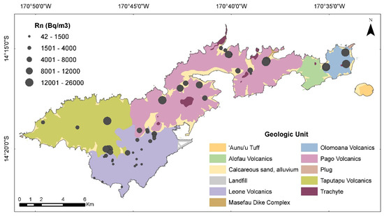 The Olomoana Volcanics, Pago Volcanics, and Taputapu Volcanics formed during the Pliocene to earliest Pleistocene Epoch while the Leone Volcanics and sedimentary rocks formed during the recent Quaternary Period [19]. This relationship between 222Rn concentrations and geology was expected since 222Rn concentrations increase as groundwater residence times increase until steady-state concentrations are reached within about 20 days [13]. As the host rock surface area increases, more 238U and 226Ra become exposed at the mineral–water interface, thus enabling 222Rn to dissolve into the groundwater system [20]. Measured 222Rn activities therefore reflect the geology of the groundwater flow over the last 20 days before sampling. A distinct difference was detected between 222Rn concentrations in groundwater of the Tafuna–Leone Plain and groundwater sampled throughout the rest of Tutuila (Figure 3). This is consistent with the geochemical differences as previously described by [21] between the established geologic units [22]. The 222Rn chemistry indicates that samples were collected from two geochemically distinctive aquifer systems.