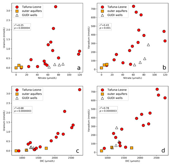 Scatterplots showing distribution and correlation between (a) NO3− and U, (b) NO3− and V, (c) dissolved inorganic carbon (DIC) and U, and (d) DIC and V. Samples collected within the Tafuna–Leone Plain are indicated by red circles. Samples collected north of the Tafuna–Leone Plain, therefore from a different volcanic series and aquifers, are indicated by orange squares. GUDI wells (groundwater under the direct influence of surface water) from within the Tafuna–Leone Plain are indicated by white triangles. Trend and significance values computed for non-GUDI samples. Data for all plots are in Table 1.