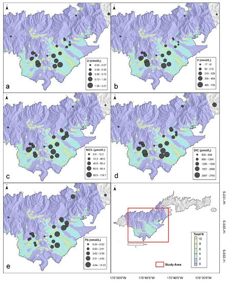 Spatial distribution of (a) U concentrations, (b) V concentrations, (c) NO3− concentrations, (d) DIC concentrations, and (e) Pb concentrations measured from groundwater across the Tafuna–Leone Plain, Tutuila, American Samoa. Concentrations are placed over a modeled total N distribution map modified from Shuler et al. [2]. Since the modeled total N distribution is a function of anthropogenic activities (OSDS, piggeries, agriculture) superimposed on groundwater flow calculations, this represents the areas that are either urbanized or downgradient of urbanization. Bottom right map displays the extent of maps (a–e), outlined by the red box. Data can be found in Table 1. The sample names associated with each sample location can be seen in Figure 2.