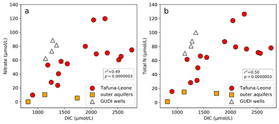 Scatterplot showing correlation between DIC with (a) NO3− and (b) TN. Samples collected within the Tafuna–Leone Plain are indicated by red circles. Samples collected north of the Tafuna–Leone Plain, therefore from a different volcanic series and aquifers, are indicated by orange squares. GUDI wells from within the Tafuna–Leone Plain are indicated by white triangles. Trend and significance values computed for non-GUDI samples. Data for all plots are in Table 1.