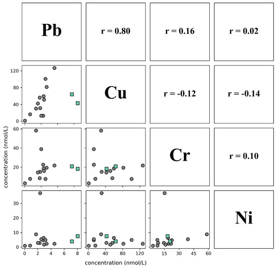 Scatterplot matrix displaying correlation of heavy metal elements in groundwater. Teal squares highlight the two samples in which elevated Pb concentrations were measured (ILI-84, TAF-171). Data are in Table 1.