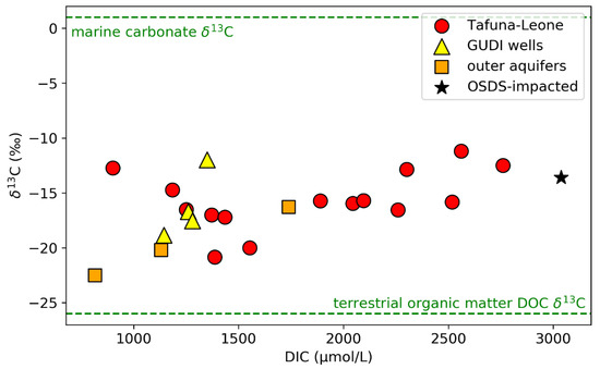 Decomposition of organic C may be able to explain the remaining DIC variability. Anthropogenic activities simultaneously introduce both organic C and N to the aquifer system, which are subsequently oxidized to DIC and NO3−, thus creating a relationship between the two. Anthropogenic activities such as OSDS and piggeries are the primary sources of NO3− contamination in the Tafuna–Leone Plain [2]. The correlation between DIC and NO3− (Figure 6) suggests that the DIC detected in the Tafuna–Leone Plain may also be anthropogenically sourced, since samples collected from populated areas show higher DIC concentrations than samples collected from natural areas (Figure 5d). Additionally, δ13C measurements suggest an anthropogenic source of DIC to the groundwater system. Literature values of DIC and δ13C from OSDS impacted groundwater are ~3000 µmol/L and −13‰, respectively [50]. The OSDS δ13C endmember literature value is similar to the measured values from the impacted areas of the Tafuna–Leone Plain (Figure 8).