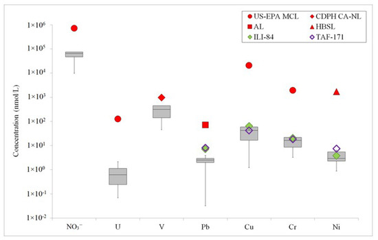 While all trace metal concentrations observed in this study were well below advisory limits, it is nonetheless important to monitor the occurrence and concentration of U and V because of their potential health risks at higher concentrations. The consumption of U can lead to cancer and nephrotoxicity [6,31]. The U.S. EPA set a maximum contaminant level (MCL) for U of 30 µg/L (126 nmol/L) [6,39,53] (Figure 9). Inhalation of vanadium-containing dust can lead to throat, nose, and ear irritation, pneumonia and bronchitis [54,55]. Studies that administered V supplements to both humans and animals found that side effects vary based on the duration of exposure and dosage of V. Some of the most common side effects include mild gastrointestinal disturbance and functional disturbances of the liver and kidneys [56]. The California Department of Public Health (CDPH) set a notification level (CA-NL) of 50 µg/L (981 nmol/L) for V in water [9] (Figure 9).